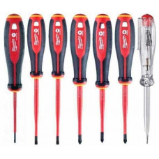 Milwaukee 4932478739 — професійний діелектричний набір із 7 викруток для електромонтажу та сервісних робіт під напругою. До складу входять шість робочих викруток — плоскі SL2,5, SL3, SL4, SL5,5 і хрестові PH1, PH2 — а також викрутка-тестер напруги, щ..
